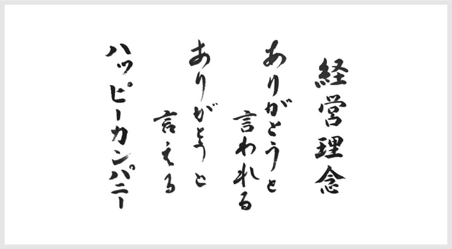 現会長の金井正光と現専務である金井和代は、平成14年にこれからは中小企業においても「経営理念」が必ず必要であると考え、かねてからの願いでもあった「経営理念」の策定にとりかかりました。策定にあたり、まず自分は個人的にもビジネスでもどんな夢をもっているかを掘り下げて考えることから始めました。 ビジネス的には、数値目標以外に、社員に対する思いが(社員満足)強く打ち出されました。 一生涯の時間のほとんどを会社で過ごす社員とは家族同然であり、父であり、母であり、兄弟姉妹であります。みんなで幸せにならなければと強く思っていました。社長と社員は一体であり、お互いに感謝・素直・共感がなければ会社は成り立ちません。 また、世界をどう感じているか(世界観)や人生感や仕事感や人間性とは?などを今まであまり深く考えていなかったことも気付かされました。それからしばらくは、そのことが頭を離れず、自己嫌悪と試行錯誤を繰り返した結果、これからの世界は、理性から感性の時代に移り、一人ではなく、まわりに生かされていることに感謝できる人となること、つまり報恩感謝がすべてであるという結論になりました。 このような考えのもとに社長は、まず社員に感謝の気持ちで接し、社員はお客様に感謝の気持ちを伝え、仕入先様にも感謝の気持ちを持つことにより、幸せの輪が広がり、オールハッピーに繋がると信じ、その願いをこめてこの経営理念が完成しました。